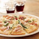 Using a rolling pin or your hands, gently roll out or stretch the pizza dough into a 10-inch round. Lightly dust a pizza peel with flour and lay the dough on top. Lightly brush the dough with the garlic-infused olive oil. Scatter the mozzarella cheese evenly over the dough, leaving a 1/2-inch border. Arrange the asparagus and onion on top. Drape the prosciutto over the vegetables.