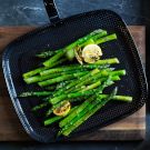 When asparagus reaches its peak in the springtime, highlight its grassy flavor by preparing it simply, as in this recipe cooked in a nonstick grill pan. The high heat of the grill will impart a slightly smoky flavor and bring out the vegetable’s natural sweetness, but be careful not to overcook the asparagus; the spears should remain bright green and crisp-tender.