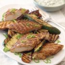 Place the chicken and vegetables on the grill. Cover the grill and cook until the chicken and vegetables are just cooked through, about 5 minutes per side for the chicken and eggplant, and about 6 minutes per side for the zucchini.