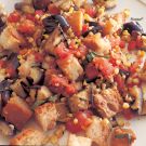 In a large bowl, combine the eggplant, corn kernels, the remaining 4 Tbs. basil and the bread cubes. Pour in the tomato vinaigrette and stir well. Transfer to a platter or serving bowl and serve immediately. Serves 6 to 8.