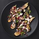 Transfer the eggplant to a serving platter and drizzle with olive oil. Sprinkle with the feta, pomegranate seeds, pistachios, mint and parsley and serve. Serves 4 to 6.