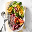 Flank steak is a great choice for salads, as it is full flavored but must be tenderized by slicing it thinly across the grain—letting you toss it easily with other ingredients. Look for cherry tomatoes in mixed sizes and colors for visual interest.
