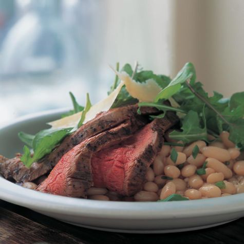 When the steak is ready, transfer it to a cutting board, cover loosely with aluminum foil and let rest for about 5 minutes. Spoon one-fourth of the hot beans onto each plate and sprinkle with the chives. Slice the steak across the grain. Arrange some of the slices on top of each mound of beans, top with the arugula and drizzle with olive oil. Using a vegetable peeler, cut thin shavings of cheese onto each serving. Garnish with the lemon wedges and serve immediately. Serves 4.