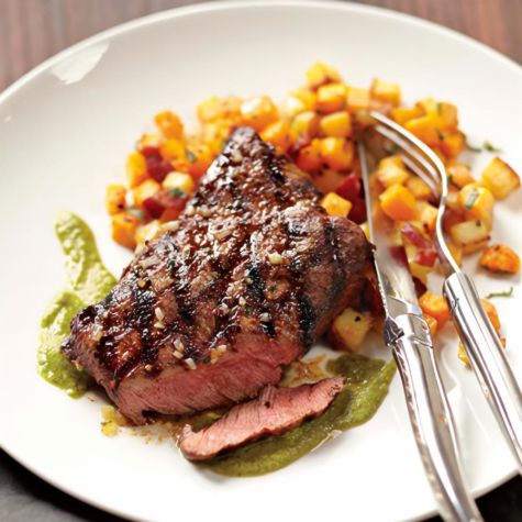 Grilled Flat-Iron Steak with Chimichurri and Butternut Squash and Rutabaga Hash
