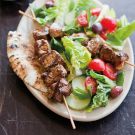 In a bowl, combine the mint, parsley and lettuce. Divide among individual plates and add the cucumber slices and cherry tomatoes. Drizzle with the dressing, top each salad with 2 skewers of lamb and serve immediately. Serves 4.