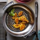 Lightly brush an outdoor fry pan with vegetable oil. Place the pan on the grill, cover the grill and preheat for the pan for about 5 minutes. Working in batches if necessary, arrange the pineapple slices in the pan in a single layer. Grill, turning once, until the pineapple is lightly charred all over, 3 to 4 minutes per side. Serve with lime wedges alongside. Serves 4.