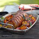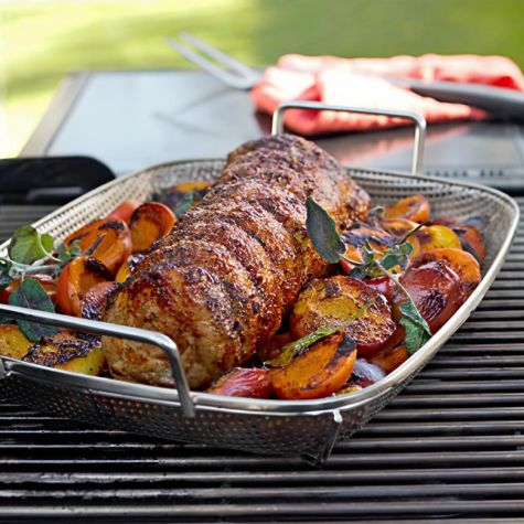 Place the roaster in the center of the grill over indirect heat, cover the grill and cook for 30 minutes. Arrange the peaches along the sides of the roaster, top with the oregano sprigs and cover the grill. Cook until the pork is well browned and an instant-read thermometer inserted into the center of the meat registers 145°F, 20 to 30 minutes more; adjust the burners as needed to maintain the internal grill temperature at 375° to 400°F.