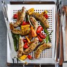 Grilling food in a perforated pan imparts a subtly smoky flavor while preventing you from losing any smaller bits, like the peppers and green onions used here, to the fire. If you don’t have a large outdoor griddle, you might have to cook the sausages and peppers in two batches in a smaller perforated pan.