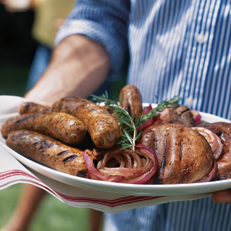 Precooked sausages made from beef, pork, lamb or poultry and flavored with a variety of seasonings are sold in the meat department of many markets. A selection of three or four different kinds is perfect for a crowd. For vegetarians, offer grilled portobello mushrooms and red onions. Provide guests with freshly grilled rolls and a selection of condiments to assemble their own sandwiches.