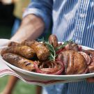 While the vegetables and rolls are on the grill, cut the sausages on the diagonal into thirds, capturing any carving juices, if possible. Arrange the sausage pieces on a warmed platter and drizzle with the carving juices. Arrange the mushrooms and onions alongside the sausages or on another warmed platter and garnish with rosemary sprigs. Serve immediately with the ciabatta rolls and condiments. Serves 10.