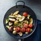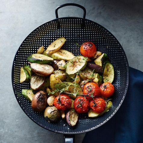 In a nonstick steel grill pan, combine the eggplant, zucchini and tomatoes. Drizzle generously with olive oil, season with salt and pepper, and toss to coat. Place the pan on the grill and cover the grill. Cook the vegetables, tossing occasionally, until the vegetables are lightly charred and the skins of the tomatoes are beginning to split, 12 to 14 minutes. Transfer to a serving bowl and serve hot. Serves 4.