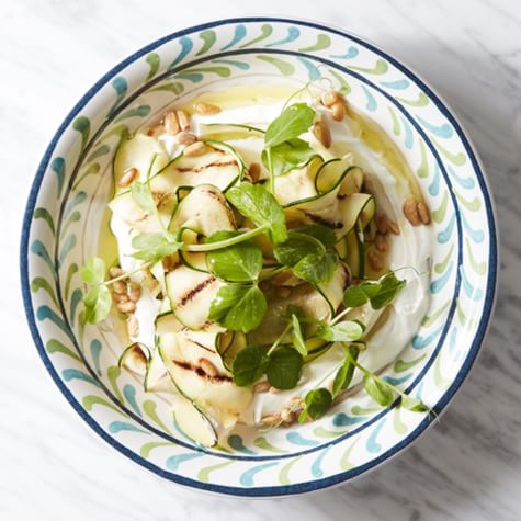 Grilled Zucchini Salad with Lemony Labneh, Pine Nuts and Pea Tendrils