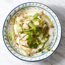 This spring-fresh salad features the season’s first zucchini, which are sliced on a mandoline and quickly grilled. Then they’re arranged atop a bed of labneh, a soft cheese made from strained yogurt. A sprinkling of pine nuts and pea tendrils finishes the dish. The tender tips of young pea plants, pea tendrils, or shoots, are often found at farmers’ markets. Their flavor is sweet like that of peas, offering a preview of all the wonderful produce to come.