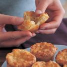 Fill the prepared muffin cups to within about 1/4 inch of the rims. Place 1 scant tsp. grated cheese in the center of each filled cup. Bake, without opening the oven door, for 10 minutes. Reduce the oven temperature to 350°F and bake until the popovers are brown, crusty and fully puffed, 8 to 10 minutes longer.