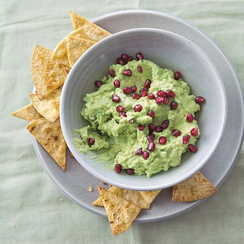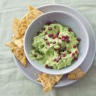 Spoon the guacamole into a serving bowl and top with the pomegranate seeds. Serve immediately with warm corn chips. Serves 6.