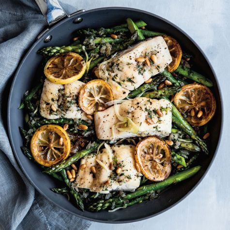 The versatile fry pan does triple duty here in this springtime weeknight meal. First it’s used for sautéing the asparagus, then for steaming the fish, and finally for simmering the sauce. Serve with steamed fingerling potatoes tossed with butter and parsley, and pour a light, crisp white wine to serve alongside.