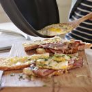 This panini was inspired by the classic French croque madame—a grilled ham-and-cheese sandwich served with a fried egg on top. In our version, we grill the sandwiches, then tuck a fried egg inside each one, along with some dressed salad greens. Serve with French fries.