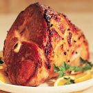 Slice the ham and arrange on a warmed platter. Pour the warm pan juices into a bowl and serve alongside the ham. Serves 16.