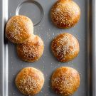 Remove the plastic wrap from the pan. Brush the tops of the buns with the egg mixture and sprinkle with sesame seeds. Bake until the buns are golden and an instant-read thermometer inserted into the center of a bun registers 190°F (88°C), 12 to 14 minutes, rotating the rack 180 degrees halfway through the baking time. Transfer the buns to a wire rack and let cool completely. Split in half and use as desired. Makes 6 rolls.