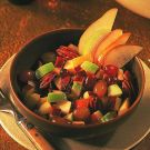 Pears predate Christianity by 2000 years. The early wild pears were bitter and almost inedible, so grafting methods were introduced to produce more palatable fruits. Since then, some 6,000 varieties have been named in Europe and America alone. For this salad, the Bartlett, Red Bartlett, Anjou, Seckel or Comice is recommended. Among the grape variety possibilities are Flame, Ruby, Ribier and Thompson. Garnish each serving with thin slices of apple and pear.