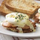 Place 2 hash brown patties on each plate. Top each patty with 1 slice of Canadian bacon, 1 poached egg and a spoonful of the hollandaise sauce. Serve immediately. Serves 6.