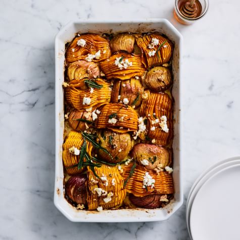 Move over, butternut—there’s a new squash in town called honeynut. Though petite in size, this winter squash packs a lot of flavor. Here it’s cut Hasselback-style, with decorative slices on top, then roasted with Hasselback apples to create an impressive side that’s perfect for autumn meals. To round out the dish, we add browned butter for toastiness, a little honey for sweetness, walnuts for crunch and fresh cheese for creaminess. If you can’t find honeynut squash, swap in their larger cousin, butternut, cutting it into 8 pieces of roughly equal size before making the Hasselback cuts as described below. A soft sheep’s milk cheese can also be substituted for the goat cheese.