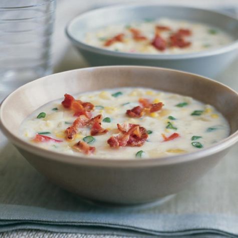 While the soup is cooking, in a fry pan over medium heat, fry the bacon, turning the slices as needed, until crisp, about 5 minutes. Transfer to paper towels to drain. Ladle the chowder into warmed soup bowls. Cut the bacon slices in half, then crumble 1/2 slice over the center of each bowl. Serve immediately. Serves 6.