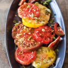 Available in a wealth of sizes and colors— yellow, orange, zebra striped—heirloom tomatoes are one of the glories of summer. Splash them with a double dose of bright vinegars, and they’ll really shine. Other fresh herbs can replace the oregano: try 1 tsp. chopped thyme or rosemary, 1 Tbs. chopped flat-leaf parsley or 2 to 3 Tbs. chopped basil.