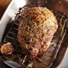 Transfer the pan to the oven and roast for 30 minutes. Reduce the oven temperature to 350ºF. Continue roasting until an instant-read thermometer inserted into the thickest part of the meat, away from the bone, registers 130ºF for medium-rare, 1 1/4 to 1 1/2 hours more.