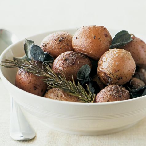 In this dish, the potatoes are roasted long enough for the skins to wrinkle slightly, indicating that they are smooth and creamy on the inside. The rosemary sprigs and the sage sprigs, even if very dark and crisp, can be presented with the potatoes as a crunchy, edible garnish. Served at room temperature, the potatoes are a good choice for a buffet.