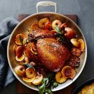 Transfer the chicken to a carving board, cover loosely with aluminum foil and let rest for 10 minutes. Carve the chicken and serve immediately with the orange slices, garlic and apples alongside. Serves 4 to 6.