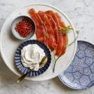 Most gravlax recipes are tricky because they require weighting down the fish to expel moisture. Chef, writer and teacher Andrew Zimmern, however, says that this ruins the texture. His version uses salt and sugar to draw out the liquid from the fish, so the texture and flavor are superb. In addition to being the perfect topper for Hanukkah latkes, this gravlax works equally well on bagels or toasted and buttered brioche; as a sliced, plated appetizer; or cubed and toothpicked as hors d’oeuvres.