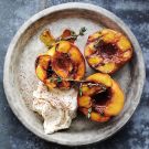 Bake until the peach juices collect in the hollows where the pits were removed, about 15 minutes. Remove from the oven. Brush the peaches with the honey, letting the juices run into the baking dish. Return to the oven and bake until the peaches are tender, about 5 minutes more. Serve the peaches immediately, with the cooking juices spooned on top, and top with the mascarpone and thyme. Serves 4 to 6.