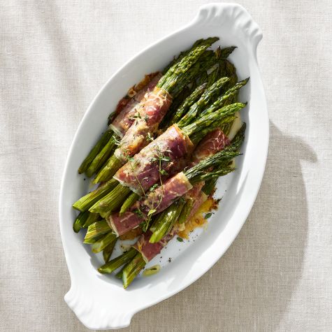 Gather 6 to 8 asparagus spears into a bundle with the tips together and wrap a slice of prosciutto securely around the middle. Repeat to make a total of 6 bundles. Brush a rectangular baking dish large enough to hold the bundles in one layer with 1 1/2 Tbs. of the olive oil. Place the bundles, seam side down, in the baking dish, arranged side by side and with the tips facing the same way.