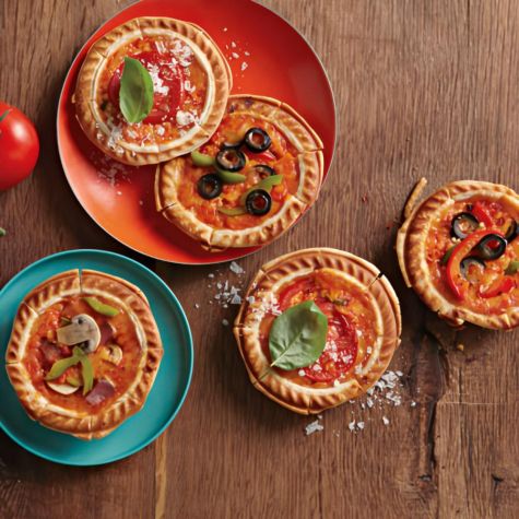 Open the pie maker and assemble the pizzas according to the manufacturer’s instructions, using the dough rounds for the base of each pizza and 1/3 cup filling per pizza. Close the lid on the pie maker, ensuring the latch clicks into place, and bake until the dough is cooked through and golden brown, about 10 minutes. Using a mini-pie lifter, a nonstick heatproof spatula or tongs, carefully transfer the pizzas to a wire rack and let cool slightly, about 5 minutes, before serving. Makes 4 individual pizzas.