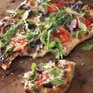 Carefully transfer the pizzas to a cutting board and top each with some of the arugula and basil. Drizzle with a little olive oil and sprinkle with salt. Cut into wedges and serve immediately. Serves 4.