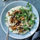While the rice cooks, in a large sauté pan over medium heat, cook the pancetta, stirring often, until the fat starts to render, about 3 minutes. Add the mushrooms and continue to cook, stirring occasionally, until the mushrooms are tender, about 5 minutes. Stir in the peas and cook until heated through, about 1 minute more. Season with salt and pepper.