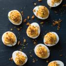 Spoon the yolk mixture into a pastry bag fitted with a large star tip and pipe about 1 heaping tablespoon into each egg white half. Top with some bread crumbs and a sprinkle of parsley and serve. Makes 24 deviled eggs; serves 12.