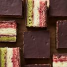 Also known as Neapolitan cookies, these tricolor treats consist of three layers, each a color of the Italian flag, which are sandwiched together with raspberry preserves and topped with a thin layer of chocolate. Although they take some time to assemble, they can be made up to a week in advance and make a striking dessert or addition to a holiday cookie platter. Almond paste, often sold in 7-ounce (200-g) tubes, is available at many grocery stores and online. Don’t substitute marzipan, which has a finer texture and is sweeter than almond paste.