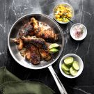 Jamaican in origin, jerk seasoning combines chiles with a medley of aromatic spices and lends a fiery kick to all kinds of meat, such the chicken we use here. To tame the heat, we serve a refreshing mango salsa alongside. If you want to get a jump-start on the recipe, the marinade and dry rub can be prepared and whisked together up to 3 days in advance; cover and refrigerate until ready to use. The mixture includes Scotch bonnet peppers, which are hot, but if you prefer a milder version, swap in a jalapeño instead. Be sure to wear gloves when rubbing the marinade onto the chicken, as the oils from the pepper can burn your skin. Our Test Kitchen loves to double the dry rub and keep half of it on hand as an everyday chicken seasoning. In place of the bone-in chicken, feel free to use boneless, skinless chicken breasts; roast them in a 450°F (230°C) oven until the internal temperature registers 165°F (74°C), 15 to 18 minutes.