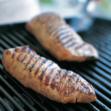Remove the pork from the marinade, place on the rack and cover the grill. Cook, turning occasionally, just until the pork feels firm and springs back when pressed, or an instant-read thermometer inserted into the thickest part of the meat registers 145°F, 10 to 12 minutes; do not overcook.