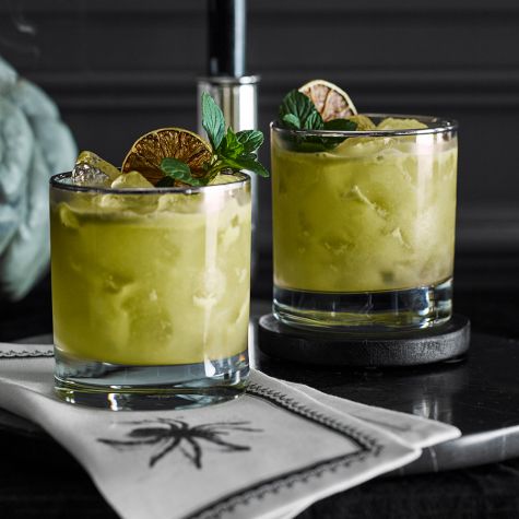 Garnish with a fresh mint sprig and a dehydrated citrus segment and serve. Serves 1.
