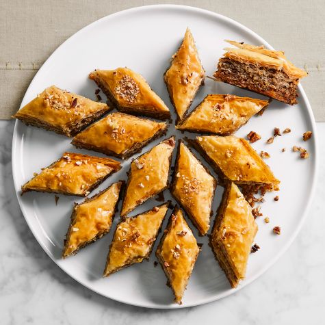 Several layers of crunchy phyllo dough surrounding a sweet, chewy filling makes this recipe a favorite of Joshua Weissman, author of the cookbook Texture Over Taste. And, since it can be made in advance, it makes a perfectly sweet ending to a Rosh Hashanah meal. To make a dairy-free version of this dessert, simply swap the unsalted butter for the same amount of vegan butter and proceed as directed.