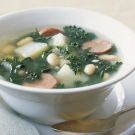 Generous measures of kale and beans make this soup filling enough to serve as a main course, accompanied by whole-grain bread. Using a modest amount of sausage deepens the soup’s flavor; vegetarians can replace it with meatless sausage or smoked tofu. Portuguese linguiça or chorizo is traditional, but using low-fat turkey kielbasa imparts the same smoky, spicy flavor with less fat.