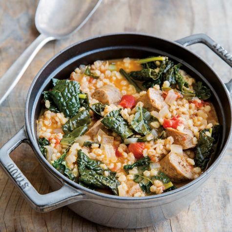 Add the remaining 1 Tbs. olive oil, the onion and garlic to the saucepan and sauté until the onion is translucent, about 4 minutes. Cut the sausage links into 1-inch (2.5-cm) slices and return them to the saucepan. Cook, stirring often, until the sausage is cooked through, about 5 minutes. Add the tomatoes with their juices and the broth. Bring to a boil, reduce the heat to low and simmer for 10 minutes. Add the barley and the kale and cook just until the kale softens, about 5 minutes. Season the soup with salt and pepper, ladle into warmed bowls and serve immediately. Serves 4 to 6.