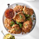 Kelsey Barnard Clark, a Top Chef winner and the queen of Southern hospitality, loves to host outdoor fry parties, which she calls fry day fetes. “There is just something so celebratory and straight-up fun about a fry day fete,” she says. “It just feels like a party, y’all.” And by frying the food outside, she avoids the mess and smell. Published in Kelsey’s cookbook Southern Get-Togethers, this fried chicken recipe is one of her favorites and makes a wonderful main course for a Mother’s Day party. First the chicken is soaked in a buttermilk brine, then dredged in seasoned flour and fried. The finishing touch—a dip in sweet and spicy hot honey. You can fry the chicken ahead of time if you like and keep it warm in a low oven until ready to serve.