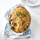 In a large fry pan over medium heat, melt 8 Tbs. (4 oz./110 g) of the butter. Add the onions and cook until golden brown, about 20 minutes. Add the zucchini and cook for 10 minutes. Add 8 to 10 grindings of black pepper, the nutmeg and mushroom powder, then sprinkle with the flour. Add the cream of mushroom soup, adjust the heat to a simmer and cook until the liquid thickens into a sauce, 3 to 5 minutes. Stir in the Gouda, green onions, parsley, tarragon and basil, then pour the mixture into the prepared baking dish.