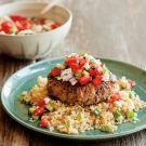 Fluff the quinoa with a fork. Stir in the 1 Tbs. olive oil and the remaining 2 Tbs. mint. Season with salt and pepper. Divide the quinoa among 4 warmed plates and top each with a lamb patty. Spoon the tomato mixture generously over the patties and quinoa and serve immediately. Serves 4.