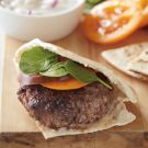 If using pita bread, cut about 1/2 inch off one side of each round and place a lamb patty in each pocket. If using buns, place a bun bottom on each of 4 warmed plates. Top each with a lamb patty. Spoon some of the yogurt sauce over each patty, then top with a couple of tomato slices and a few spinach leaves. If using buns, cover each with a top bun. Serve immediately and pass additional sauce at the table. Serves 4.