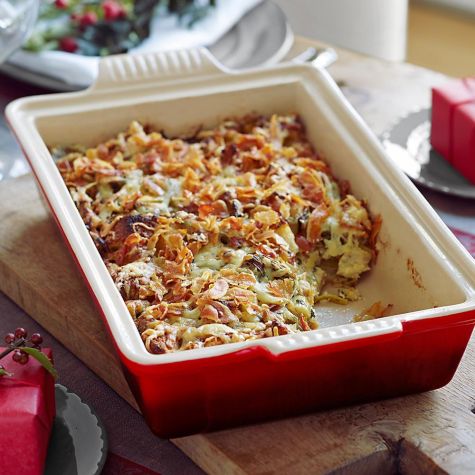 Instead of stuffing, Ina Garten makes a savory bread pudding that is moist inside and crispy on top. She says that if you try this, you’ll never go back to stuffing a turkey again!